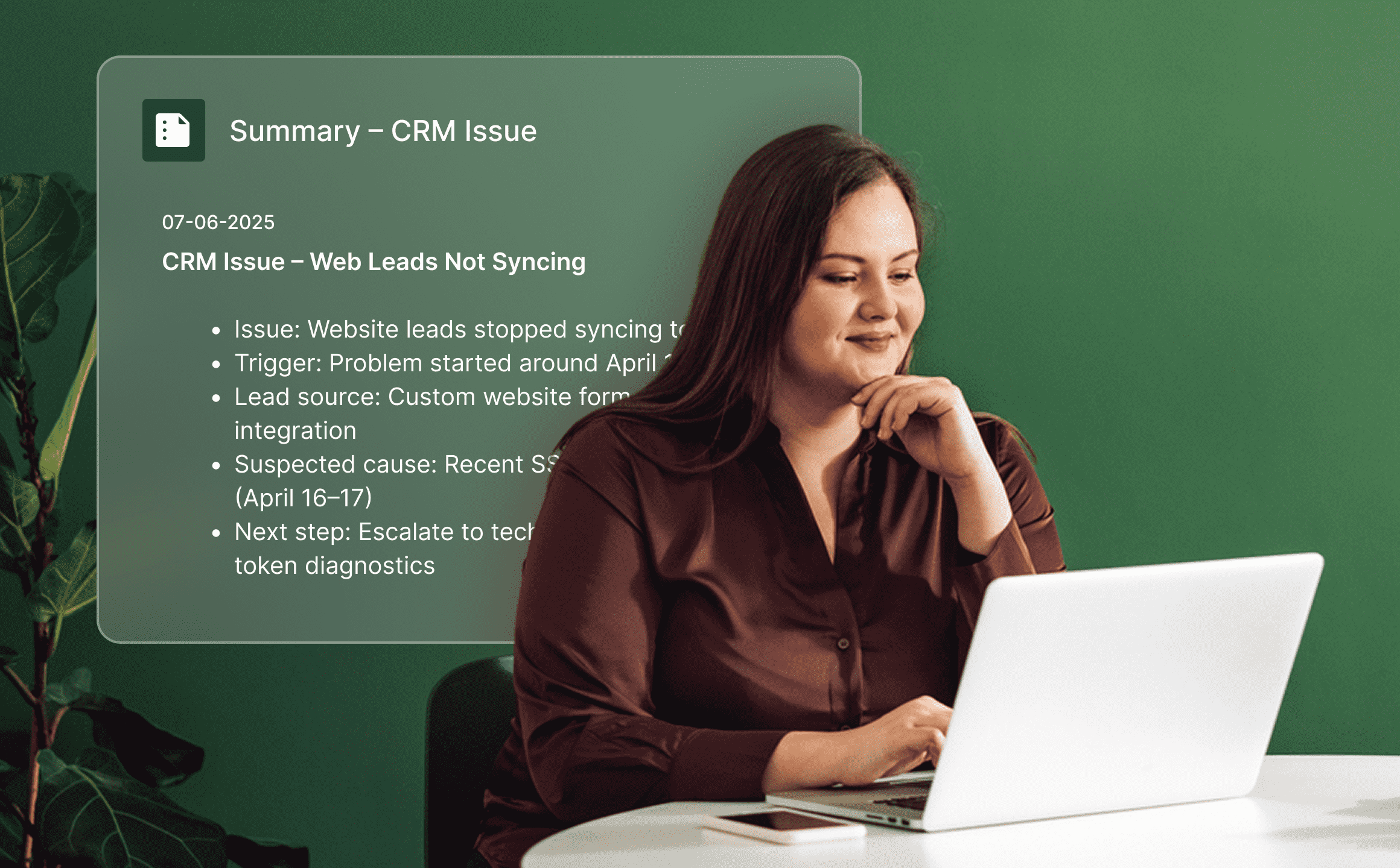 Dette gjør det enkelt å raskt lage og dele notater til kolleger, uten å måtte lytte gjennom hele samtalen i etterkant. Samtalesammendraget hjelper deg å gi bedre service, holde løfter og forenkler både oppfølging og rapportering. Perfekt for effektive møter og kundedialoger.