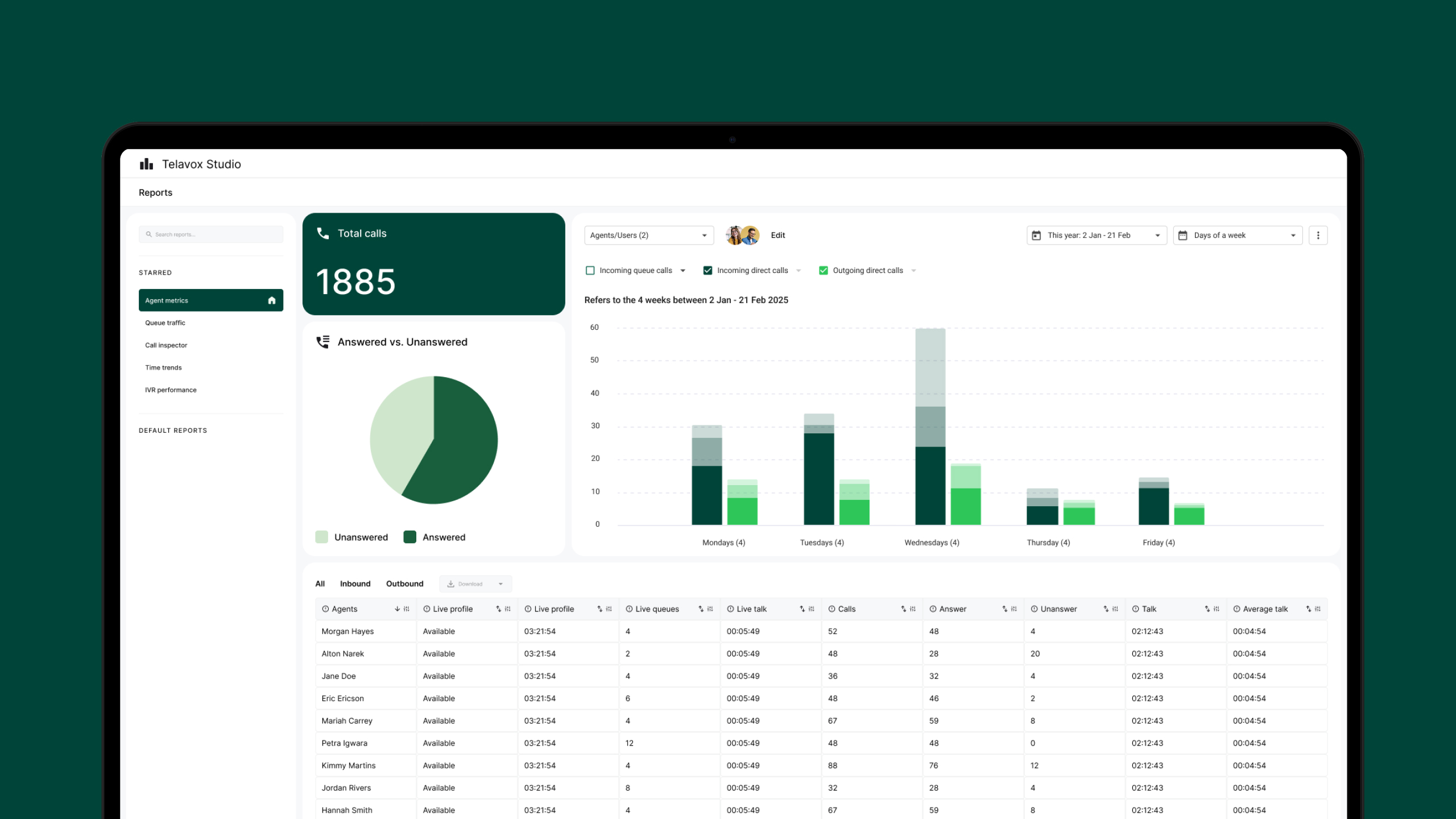Fra overordnede flyter til individuelle køer og brukere skapes et grunnlag for oppfølging og planlegging, basert på de samme samtalsdataene som brukes i ferdige visninger eller gjøres tilgjengelig via Telavox Studio API.